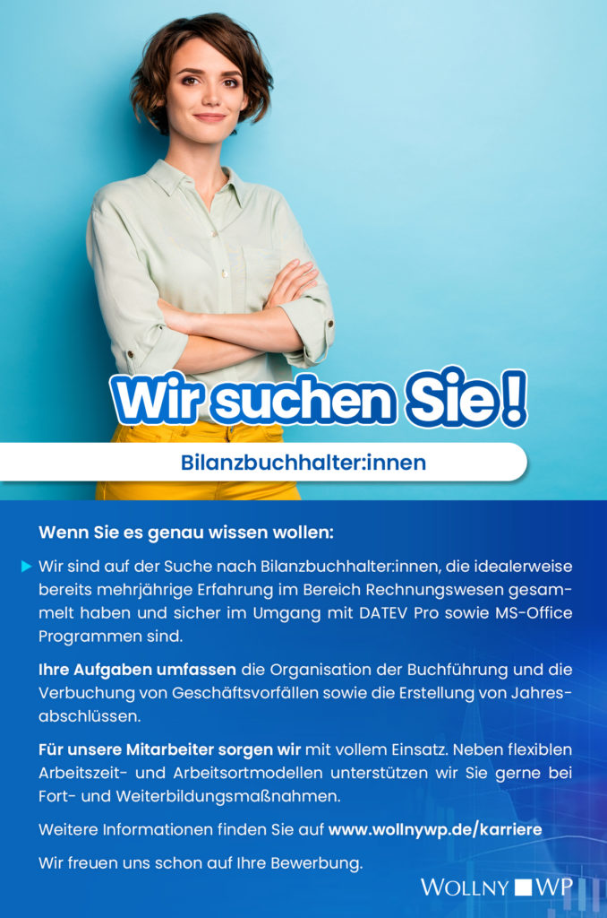 Die Tätigkeit bei WOLLNY WP ist durch anspruchsvolle Aufgaben und Eigenverantwortung geprägt. Hierbei schätzen unsere Mitarbeiter das von uns entgegengebrachte Vertrauen und die damit verbundene Anerkennung.