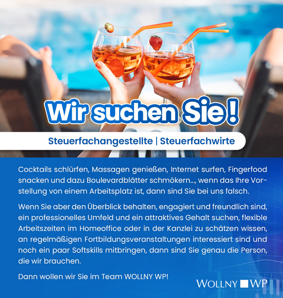 Klingt nach einem Job, der zu Ihnen passt? Dann schicken Sie uns gleich Ihre Bewerbung mit Gehaltsvorstellung an bewerbung@wollnywp.de. Wir freuen uns schon.